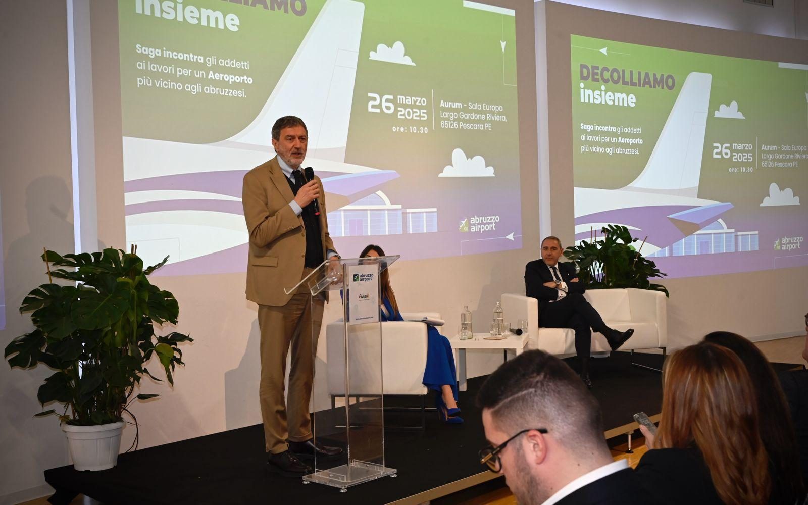 (REGFLASH) Pescara, 26 mar. “Non manca molto affinché l’aeroporto internazionale d’Abruzzo, nel giro di qualche anno, possa diventare il terzo aeroporto al servizio di Roma”. Lo ha confermato, questa mattina, il presidente della Regione, Marco Marsilio, nel corso di un incontro, svoltosi all’Aurum di Pescara, nel quale la S.A.G.A., la società che gestisce l’aeroporto d’Abruzzo, con in primis il suo presidente Giorgio Fraccastoro, si è confrontata con istituzioni e operatori economici sul futuro dello scalo aeroportuale abruzzese.
